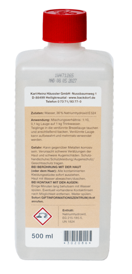 Unverdünnt ist die Brezellauge bis zu 30 Jahre haltbar, verdünnt im Kühlschrank 4–6 Wochen.