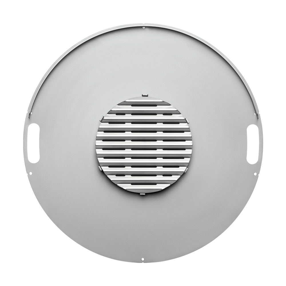 Mehr Fläche für größere Gruppen. Die Platte ist aus Edelstahl, 5 mm stark und so ausgelegt, dass sie stabile Temperaturzonen liefert. Praktisch: integrierte Tragegriffe und ein Innenring, der Fett vom Flammenschacht fernhält.