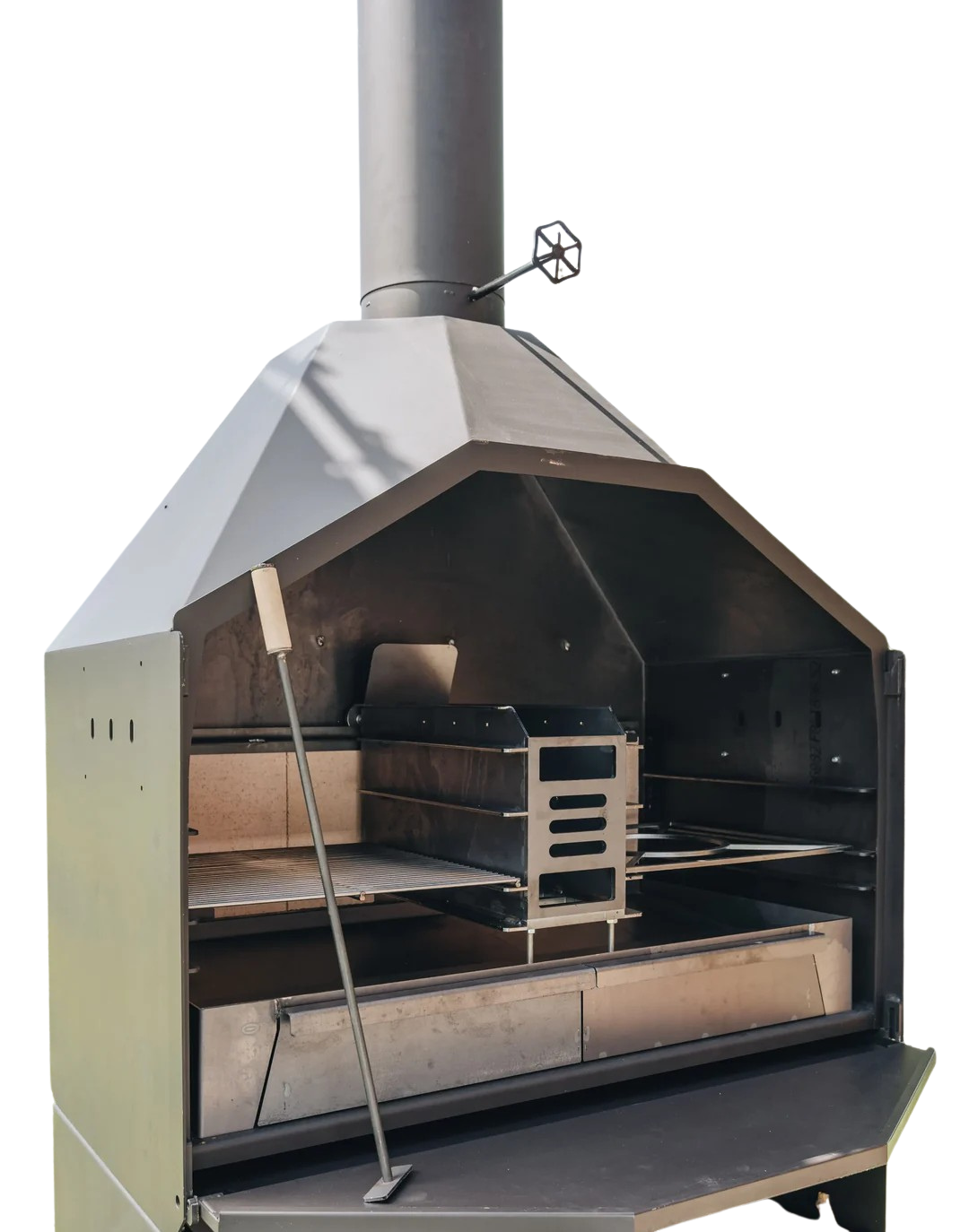 Herzstück des Braai Pro Grill ist der verschiebbare Feuerkorb. Du regelst damit die Hitze ganz einfach über den Abstand zur Grillfläche und kannst bequem Holz nachlegen, ohne dein Grillgut zu stören. Mit dem Schürhaken verteilst du die Glut am Boden und legst dir genau die Zonen an, die du brauchst – von heiß bis mild.