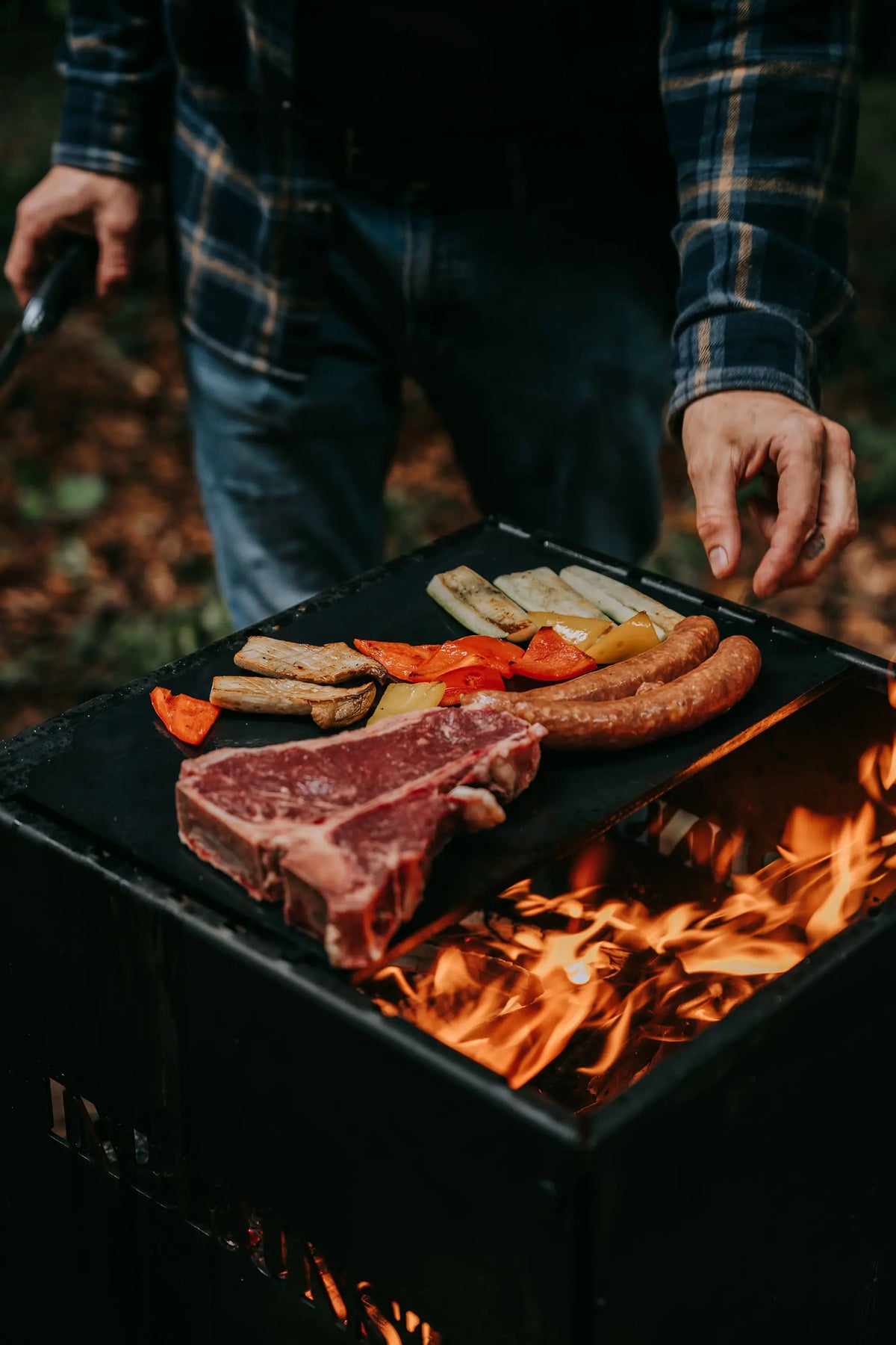 Was unterscheidet unsere Feuerbox von anderen Lösungen? Es ist die durchdachte Konstruktion und die hohe Qualität des Materials. Gefertigt aus robustem Stahl, steht sie für Langlebigkeit und zuverlässige Performance in deiner Outdoor-Küche. Die Basis bildet ein Modul mit einer kleinen, abnehmbaren Grillplatte, die sich dank eines cleveren Mechanismus leicht entfernen lässt. Eine integrierte Metallplatte deckt die Feuerstelle ab und sorgt für optimale Zugregulierung. So behältst du stets die Kontrolle über die Hitze. Das ist Inbrunst: spürbare Handwerkskunst.