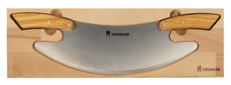 Mit dem hochwertigen Häussler Pizza-Wiegemesser bist du bestens ausgestattet – ob für frisch gebackene Pizzen, Dinnete, Flammkuchen oder feines Gebäck. Die breite, scharfe Klinge schneidet mühelos durch Pizzen bis zu einem Durchmesser von ca. 35 cm. Dank der ergonomischen Olivenholzgriffe liegt das Messer sicher und angenehm in der Hand.
