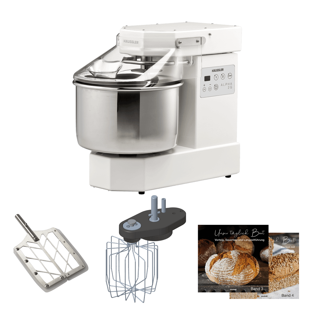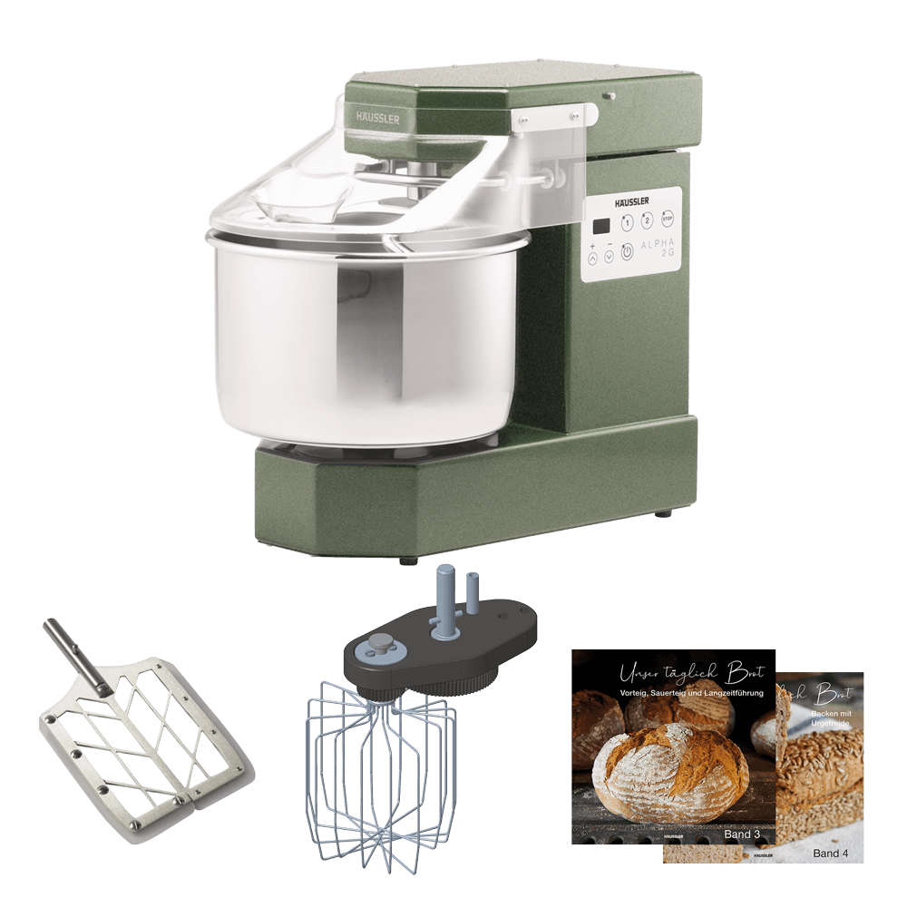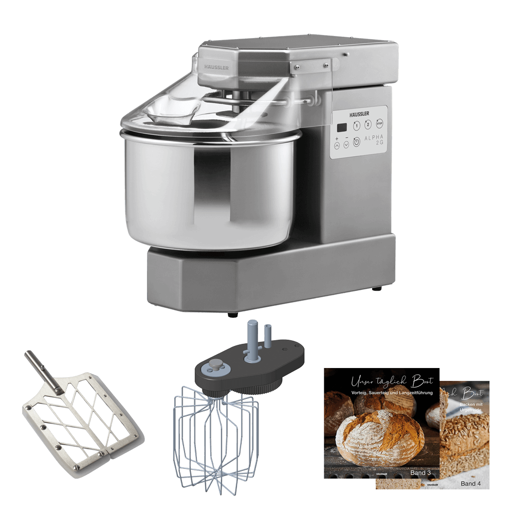 | ALPHA 2G / Paket 1 | Starterpaket für 2-Gang-Maschine mit Schneebesen und Rührpaddel | • ALPHA 2G (Farbe nach Wahl, Knethaken enthalten) • ALPHA Schneebesen und Rührpaddel • Bücher „Unser tägliches Brot“ Band 3 + 4 |