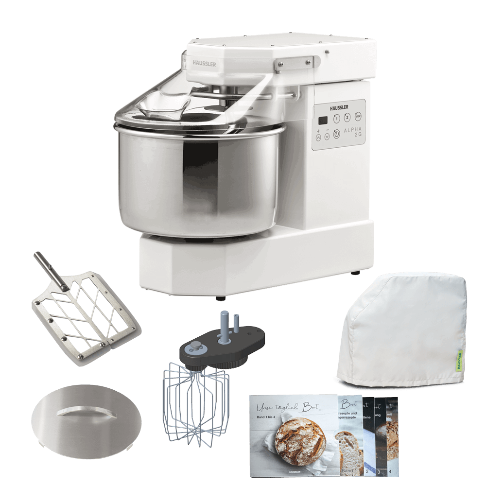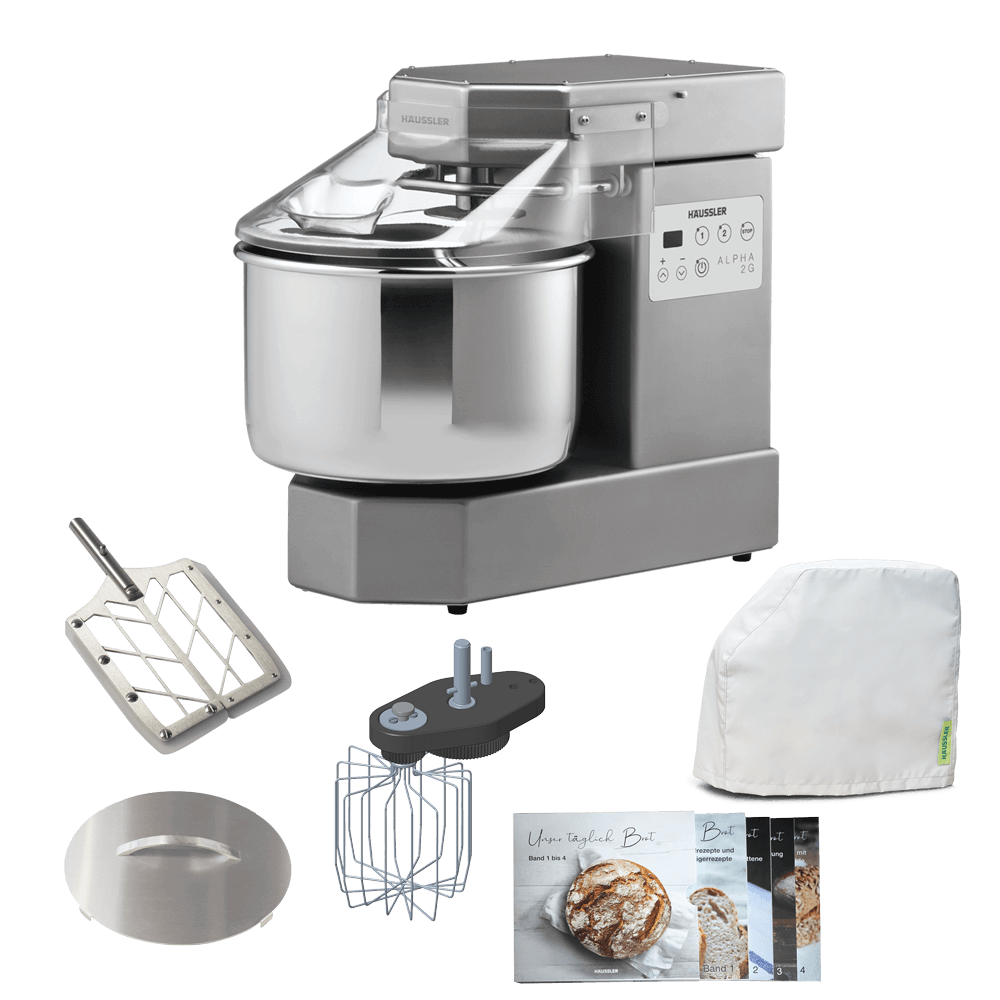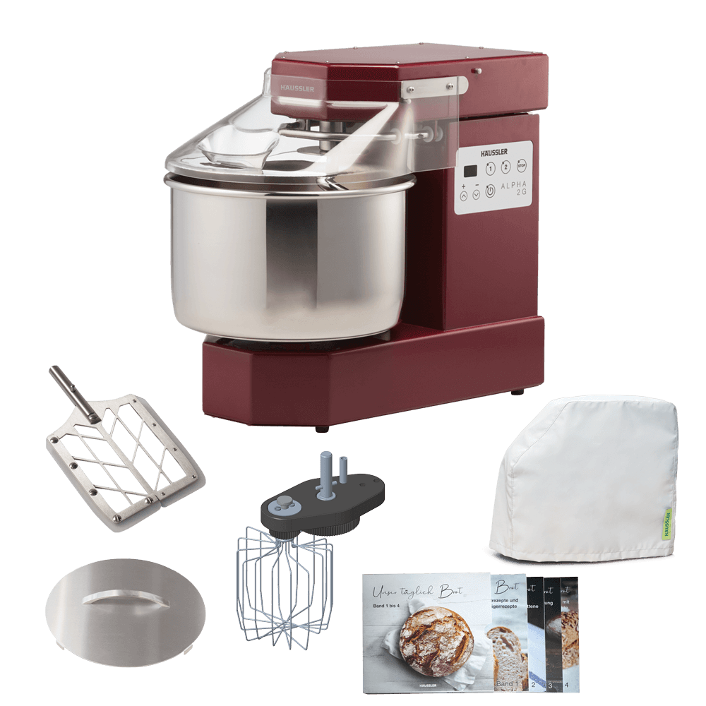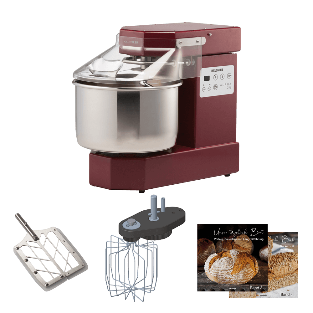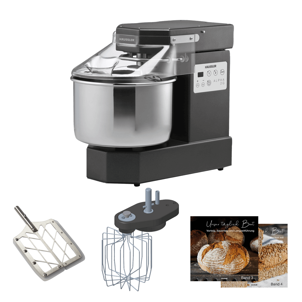 | ALPHA 2G / Paket 2 | Komplettpaket mit allen Werkzeugen und Zubehör | • ALPHA 2G (Farbe nach Wahl, Knethaken enthalten) • ALPHA Schneebesen, Rührpaddel, Abdeckhaube und Schüsselabdeckung • Bücher „Unser tägliches Brot“ Band 1–4 |