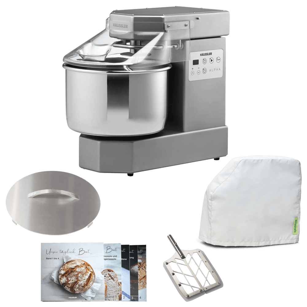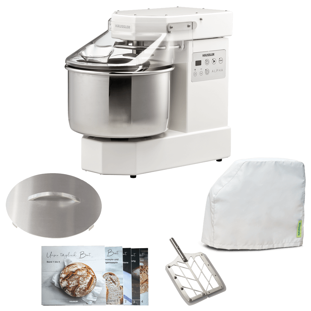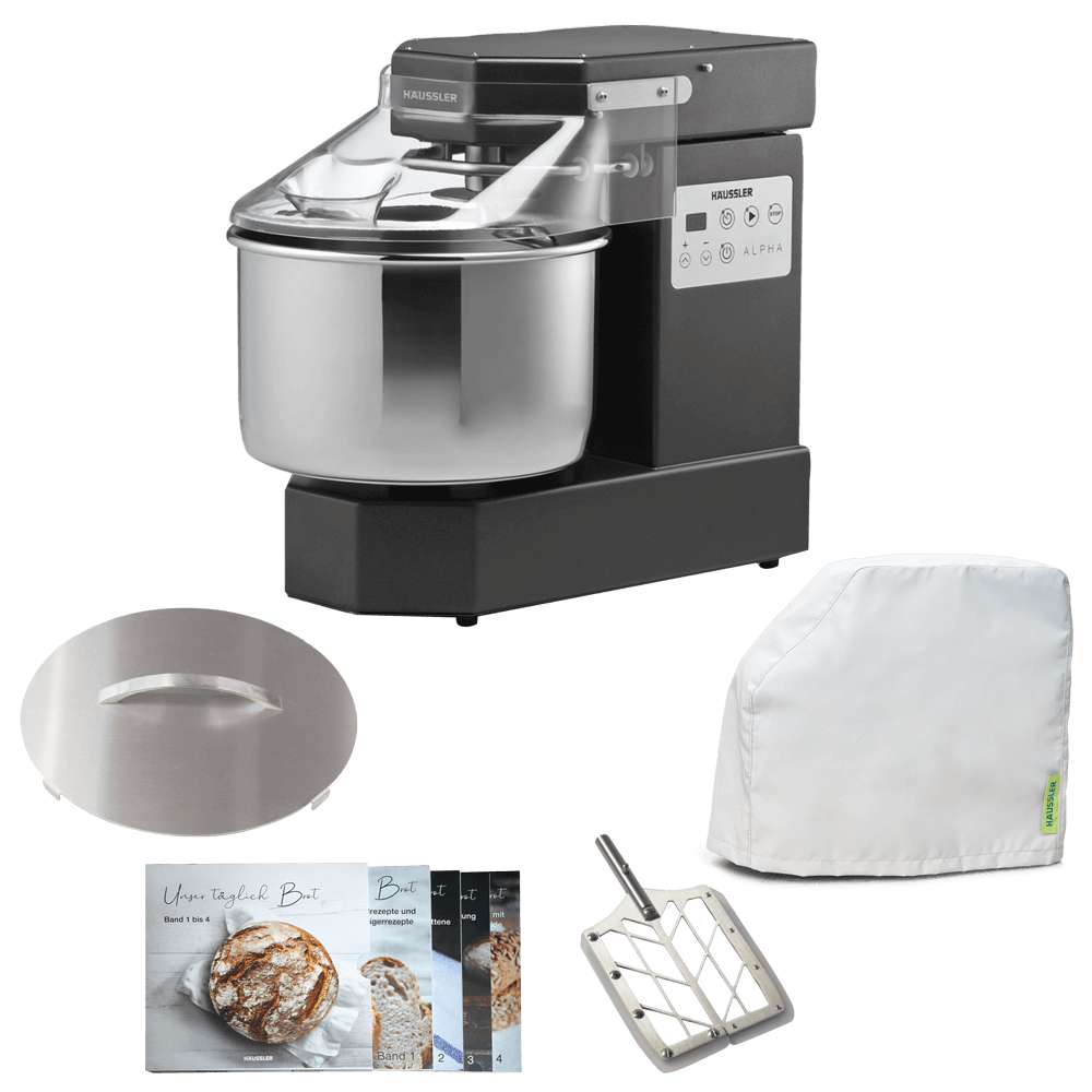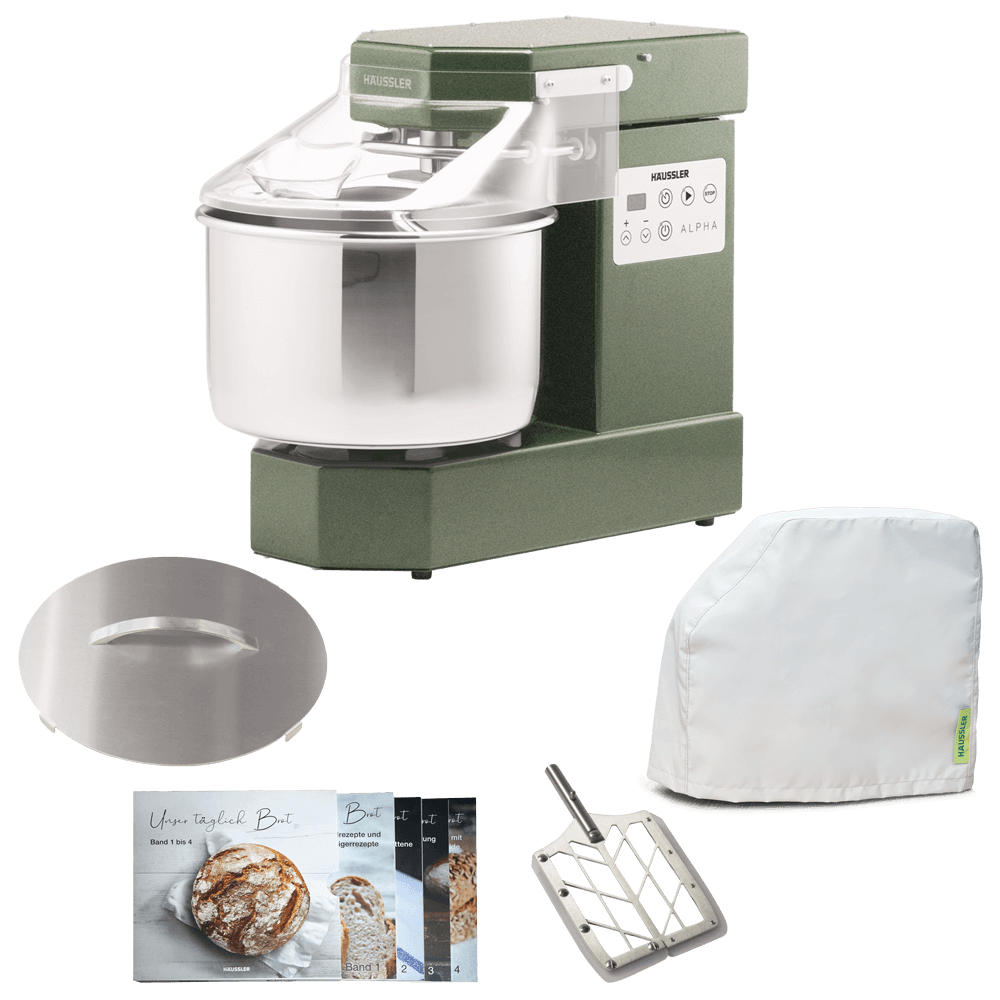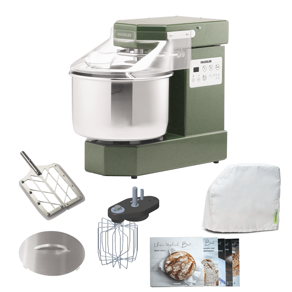 | ALPHA 2G / Paket 2 | Komplettpaket mit allen Werkzeugen und Zubehör | • ALPHA 2G (Farbe nach Wahl, Knethaken enthalten) • ALPHA Schneebesen, Rührpaddel, Abdeckhaube und Schüsselabdeckung • Bücher „Unser tägliches Brot“ Band 1–4 |