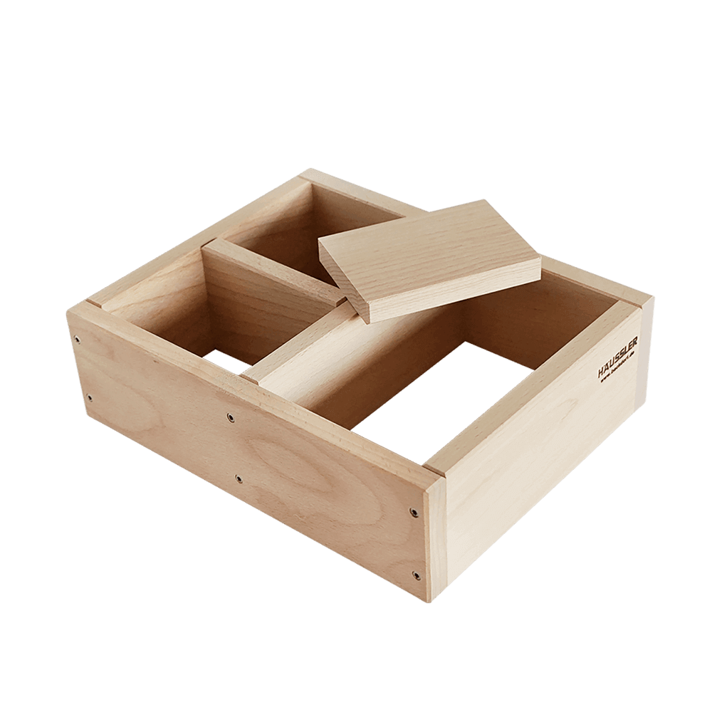 Das stabile Trennbrett sorgt für gleichmäßige Formen und eine saubere Trennung der Teige beim Backen. Wie der Holzbackrahmen selbst nimmt auch das unbehandelte Buchenholz beim Einbrennen ein leichtes Aroma an und trägt zu einer gleichmäßigen Krustenbildung bei.